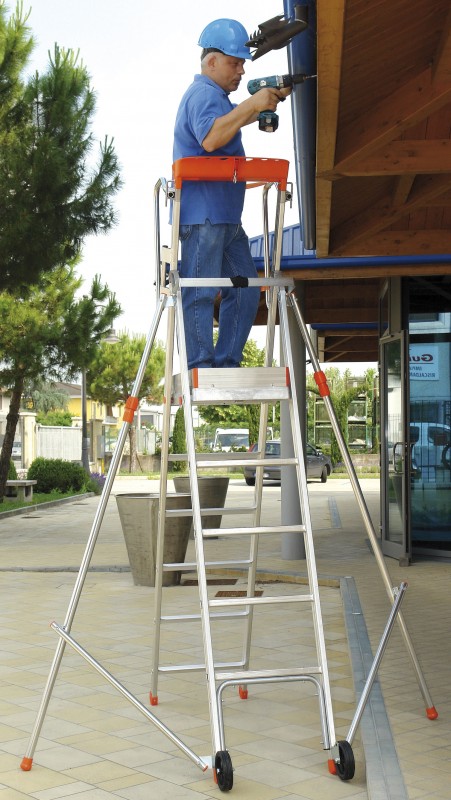 Plateforme de travail légère et maniable équipée de stabilisateurs avec verrouillage et déverrouillage semi automatique.