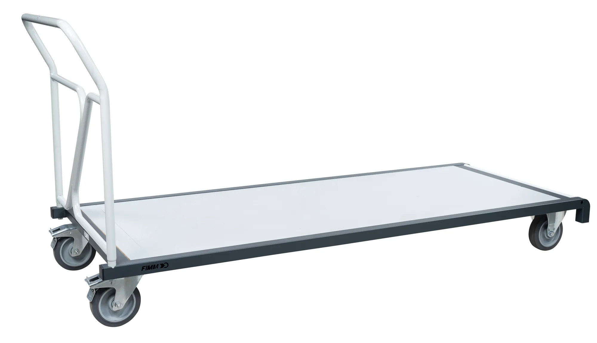 Base robuste en tube carré mécano-soudé avec des renforts sous toute la longueur du plateau. Dossier amovible permettant d’utiliser le chariot comme un grand plateau roulant pour la manutention d’autres charges encombrantes. Plateau bois mélaminé épaisseur 16 mm. 2 roues fixes + 2 roues pivotantes à frein, non tachantes, silencieuses. Effort au démarrage réduit de 50 %. Conforme à la norme EN 1757.