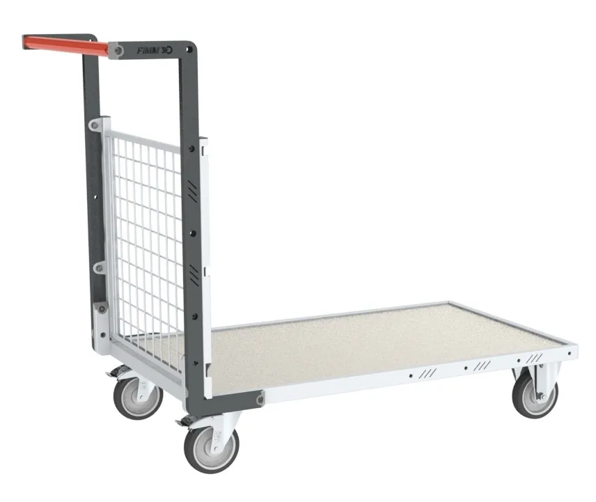 Conception robuste avec châssis en tube de 35 x 20 mm et renforts sous plateau. Plateau encastré. Dossier fixé au plateau par 3 points de fixation garantissant la longévité de l’assemblage dans le temps. Habillage grillagé en maille de 50 x 50 mm permettant le transport de charges en vrac. Poignée à hauteur ergonomique en tube Ø 28 mm permettant une bonne prise en main. Roues 2 fixes + 2 pivotantes à frein à bandage TPE Ø 125 mm sur roulement à billes, non tachantes, silencieuses. Effort au démarrage réduit de 50 %. Conformes à la norme EN 1757.