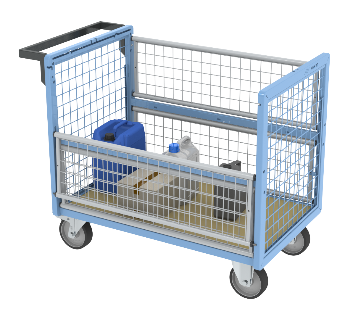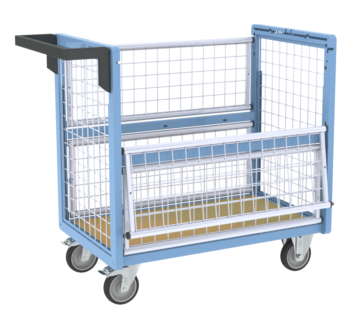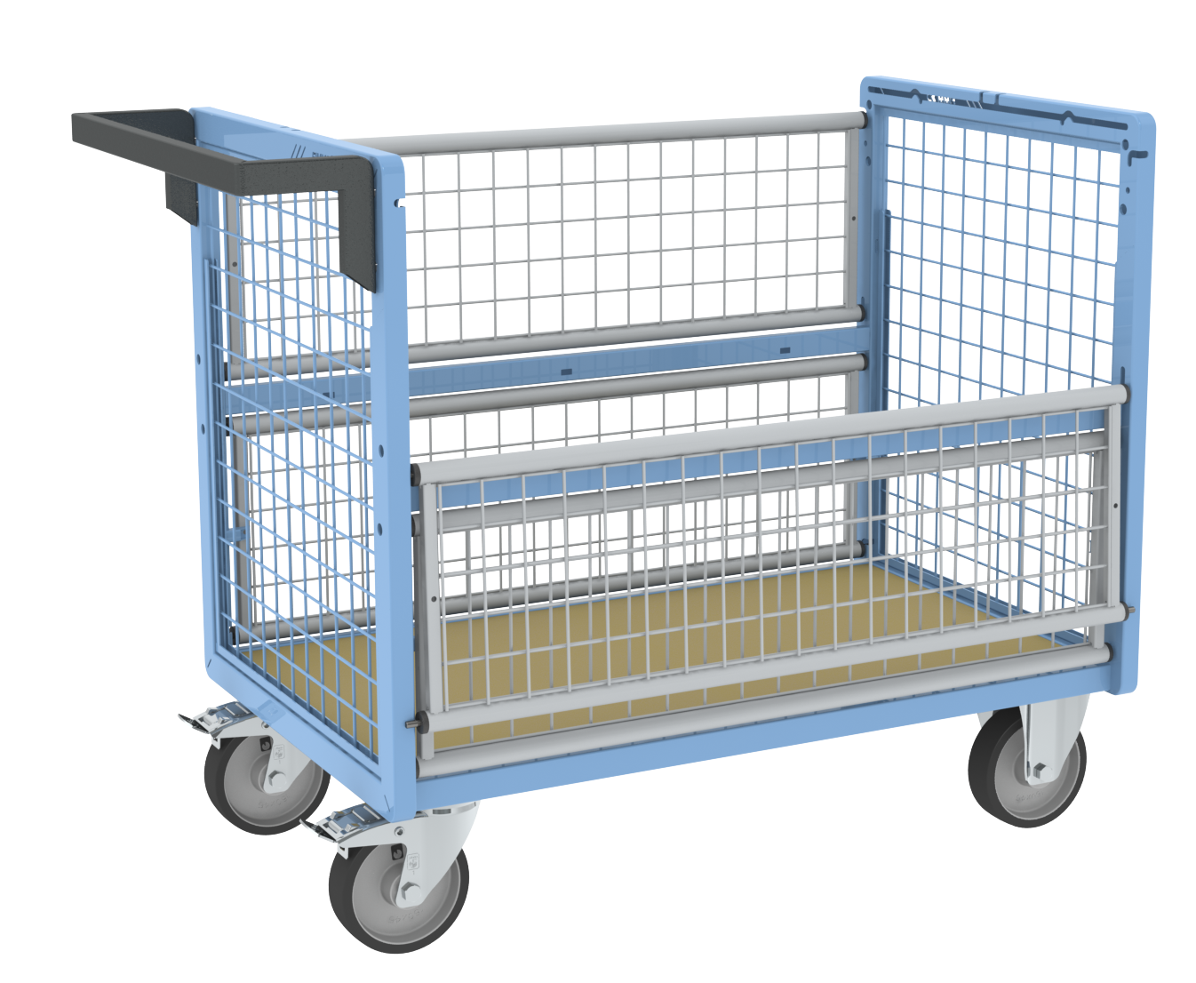 Chariot Conteneur Grillagé Sans Toit 250-500 kg, demi-panneaux rabattables, plateau bois médium robuste, roues silencieuses pour une manutention efficace.