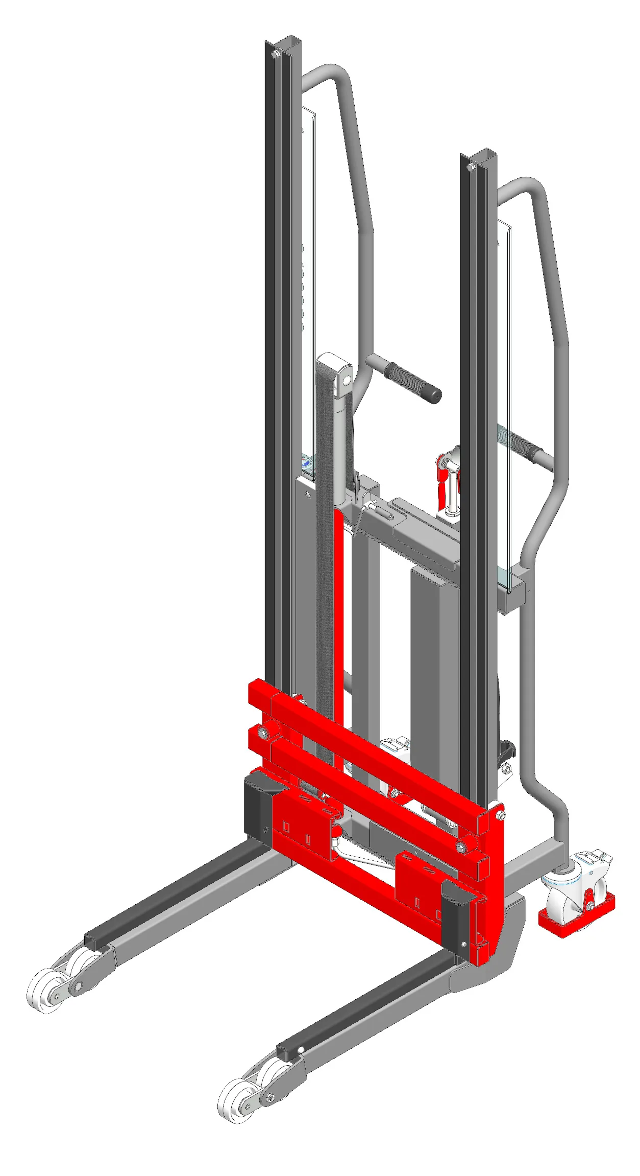 Fourches en tube carré de 30 mm, réglables de 240 à 940 mm. Roues avant Ø 80 mm polyamide. 2 roulettes arrières pivotantes Ø 125 mm polyamide avec frein.