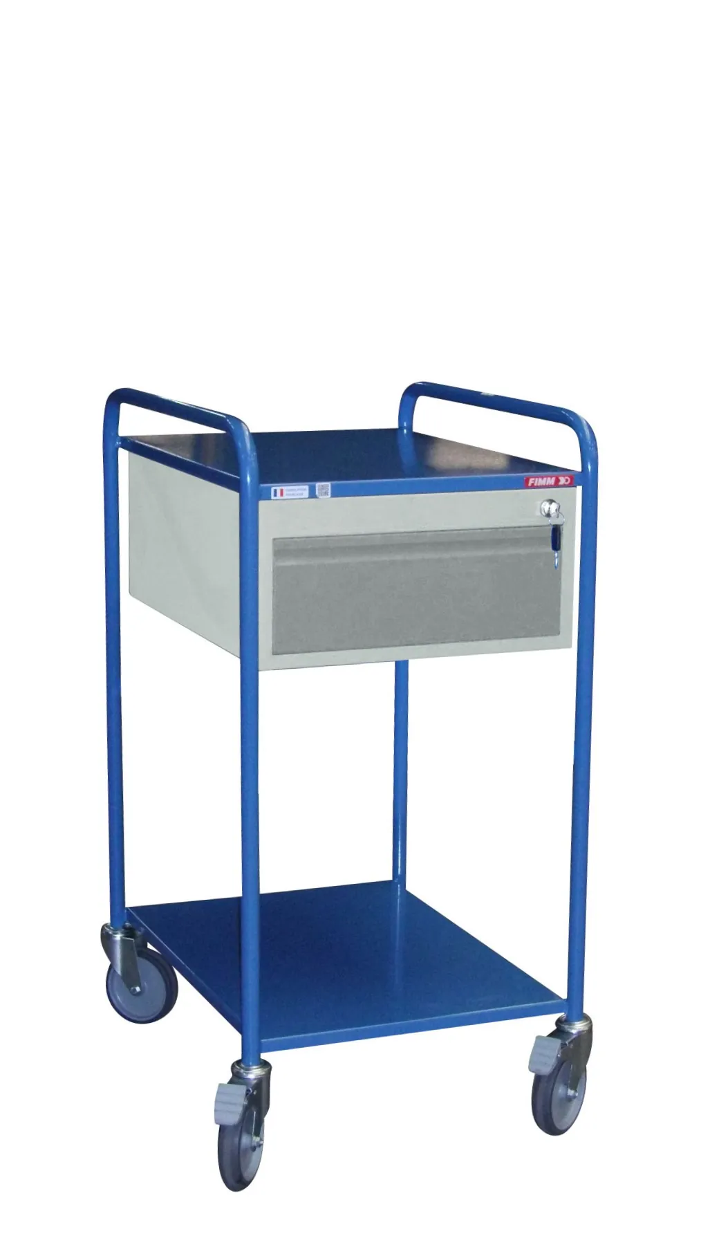 Structure entièrement mécano-soudée en tube Ø 25 mm. Plateaux épaisseur 20/10e. Hauteur du plateau haut : 950 mm. Modèle avec tiroir : jeu de 2 clés fourni. 4 roues à œil pivotantes à 360° dont 2 à frein norme EN 1757. Roues montées sur roulement à billes à bandage TPE, non tachantes, silencieuses, effort au démarrage réduit de 50 %.