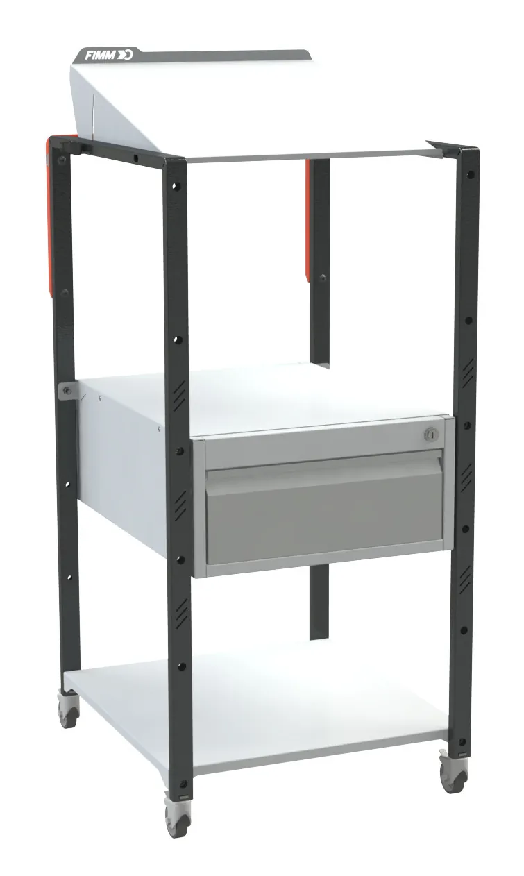 Châssis en tube rectangulaire de section 35 × 20 mm. Plan inclinable se règle de 0 à 15° par manette de blocage. Peut servir d’écritoire ou de support pour ordinateur. Jeu de 2 clés fourni. 4 roulettes pivotantes dont 2 à frein conformes norme EN 1757.