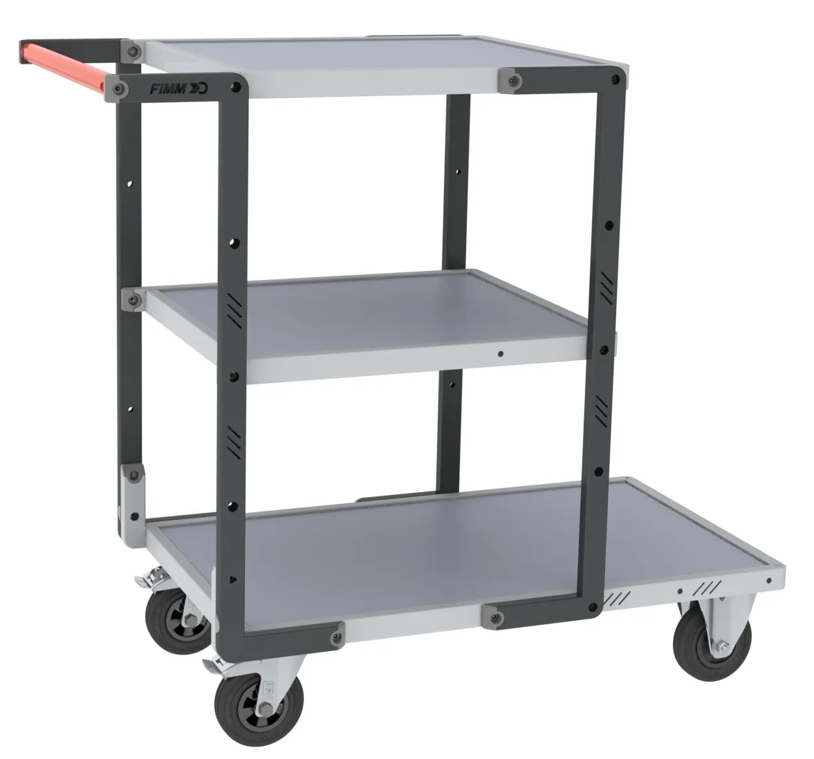 Conception robuste avec châssis en tube de 35 × 20 mm, renforts sous plateau et plateaux bois encastrés. Dossier fixé au plateau par 3 points garantissant la longévité de l’assemblage dans le temps. Conception évolutive permettant de rajouter un plateau dans un second temps. Surface de pose optimisée grâce à une poignée positionnée dans l’alignement du plateau. Charge utile du plateau supérieur (et intermédiaire) limitée à 90 kg. Plateaux en bois mélaminé d’épaisseur 16 mm d’entretien facile. Ajustement possible du plateau intermédiaire sur 3 niveaux différents, au pas de 175 mm. Poignée ergonomique à hauteur, en tube Ø 28 mm pour une bonne prise en main. 2 roues fixes + 2 pivotantes à frein conformément à la norme EN 1757. Conception démontable facilitant la réparation. Composants disponibles sur stock.